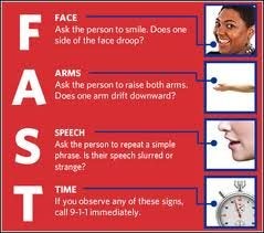 - Face (gezicht): vraag aan de persoon om te lachen of de tanden te laten zien. Als de mond scheef staat of een mondhoek naar beneden hangt, kan dit duiden op een beroerte.